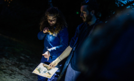 Une balade sensorielle et silencieuse avec un bandeau sur les yeux, une main sur un fil d’Ariane. Les participants à l’écoute des sons de la forêt s’ouvrent à une autre perception du milieu que celle procurée par leur seule vue.